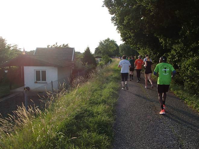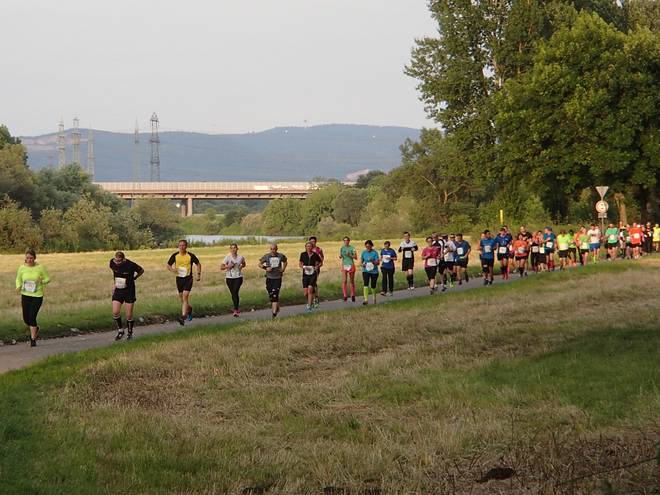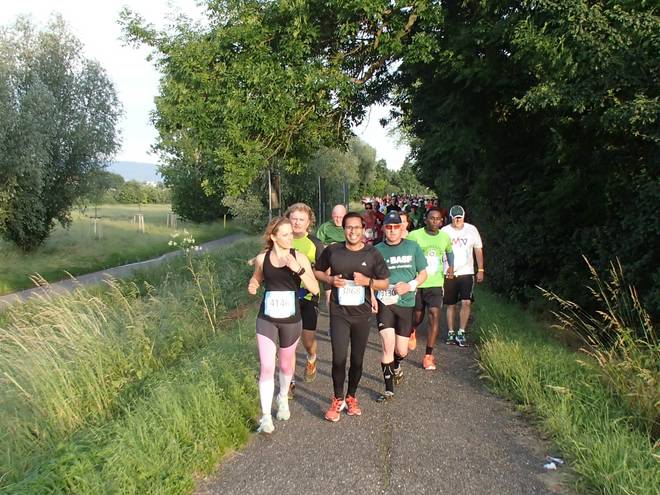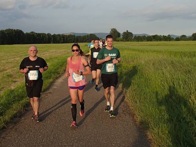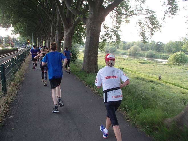 An der Neckar 20.08 Uhr / Km 13,2 Die 4:30-Stunden-Läufer sind hier ganz hinten auf dem Bild, kurz vor der Baumgrenze. |
