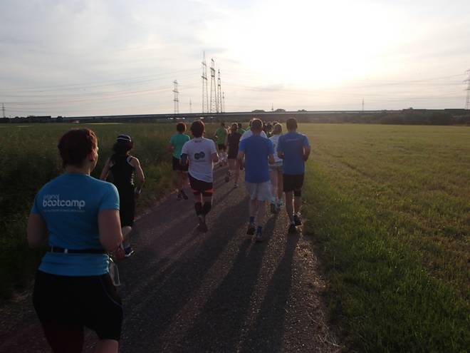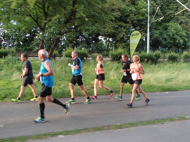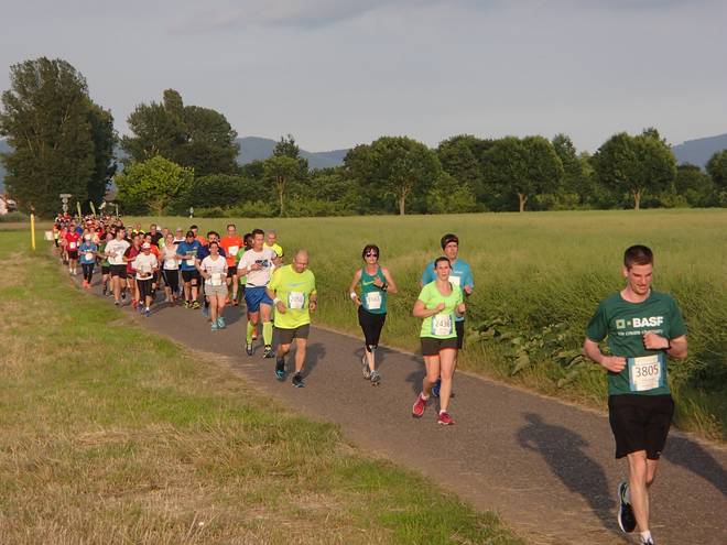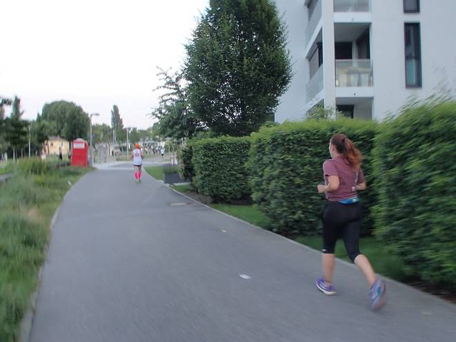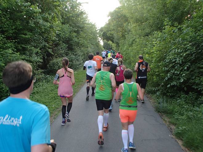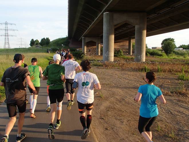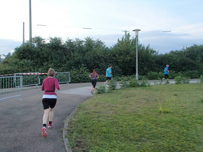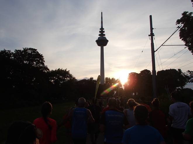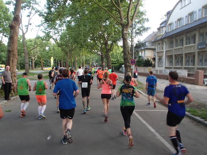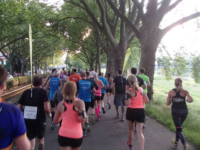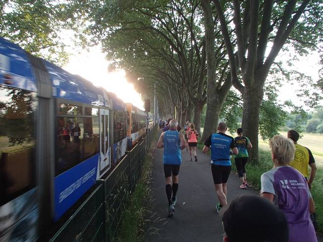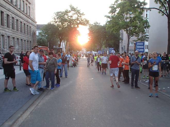 An der Neckar 20.07 Uhr / Km 13,1 Die Sonne stand immer tiefer am Himmel. Das brachte ein Dämmer-Marathon mit sich. |