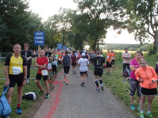 An der Neckar Neuostheim Campingplatz 20.20 Uhr / Km 15,1 Am dritten Verpflegungsstand irrte ich ein wenig umher. Erst wollte ich vorne kein Wasser, dann gab es weiter hinten kein Elektrolyt, dann war durch die Gruppe um die Zeitläufer beim Wasser alles voll. |