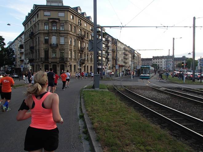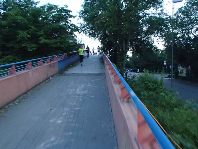 Paul-Martin-Ufer 20.30 Uhr / Km 16,4 Über eine Fußgängerbrücke wechselten wir dann über die Schienen auf die Stadtseite, also weg von der Neckar. |