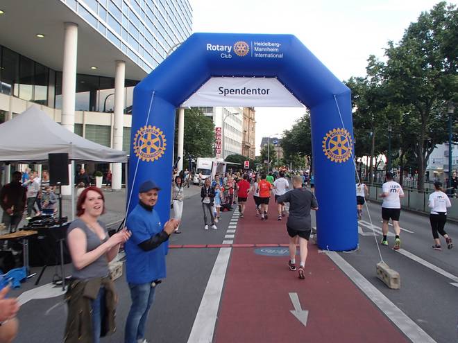 Friedrichsring 20.49 Uhr / Km 19,5 Wer das Spendentor des Rotary Clubs durchlief, der spendete automatisch € 3,00. Zum Einen für die Aktion End Polio Now, zum Anderen das Rotary Summer Camp für Jugendliche. |
