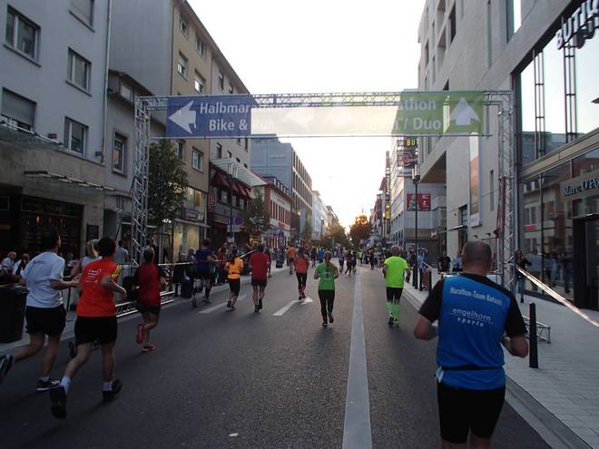 Hauptstraße 21.53 Uhr / Km 30,3 Endlich hatte ich den südlichen Wendepunkt erreicht. Jetzt nur noch die ganzen Kilometer zurück zur Konrad-Adenauer-Brücke, rüber über den Rhein und noch drei Kilometer durch Mannheim. Fertig. Bei meinem Tempo würde das noch so 1:12 Stunden dauern. |
