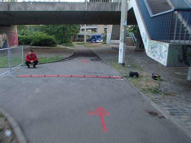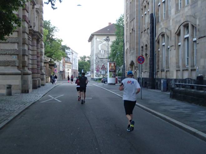 Von-Weber-Straße 21.31 Uhr / Km 26,4 Nun hatten wir das Pendel-Stück erreicht. So kurz nach Kilometer 34 kämen wir noch einmal hier vorbei. Aus der Gegenrichtung. Wie Michael mit seinem Bayern-Trikot. |