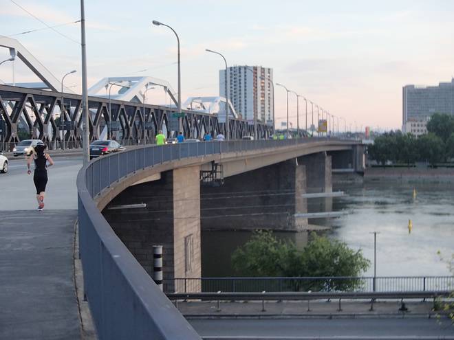Adlerdamm-Brücke 21.37 Uhr / Km 27,4 Bei der Steigung spürte ich meine Beine plötzlich wieder ganz dolle. Schlimmer war nur, daß es auf der andereb Seite wieder runter ging. |