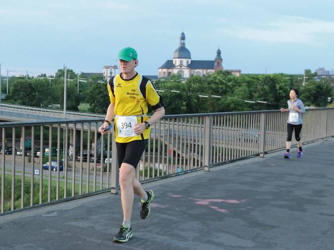 Konrad-Adenauer-Brücke 21.09 Uhr / Km 22,9 Im Hintergrund sieht man die Jesuitenkirche. Und direkt links neben meinem Kopf so gerade noch die Sternwarte. Foto: go4it-foto |