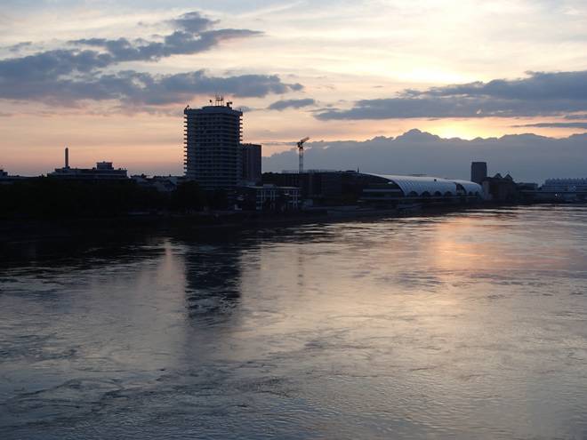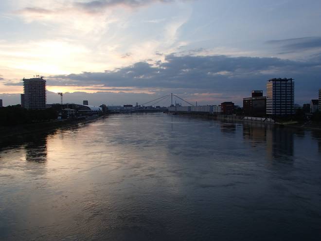 Konrad-Adenauer-Brücke 21.09 Uhr / Km 22,9 In der Ferne zu sehen die Rhein-Galerie. Die gehört schon zu Ludwigshafen. |