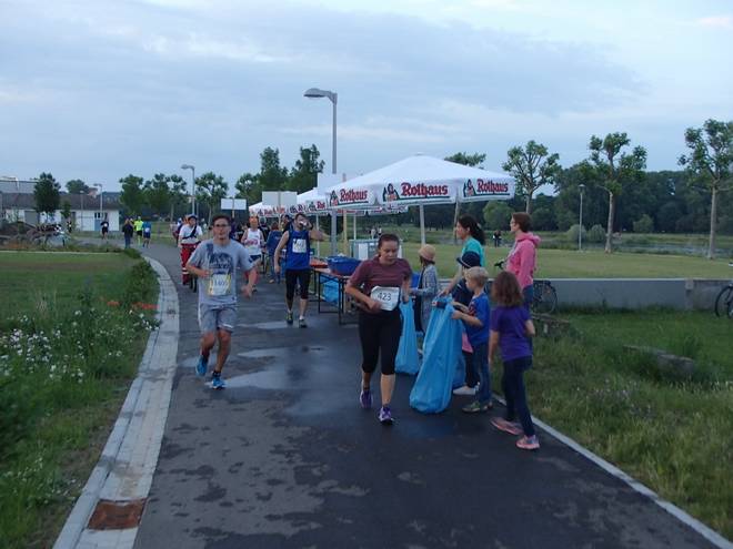 Rheinpromenade 21.21 Uhr / Km 24,6 Die Sonne verschwand zwar allmählich, aber wirklich kühler wurde es nicht. Entsprechend griff ich bei den Getränken kräftig zu. |
