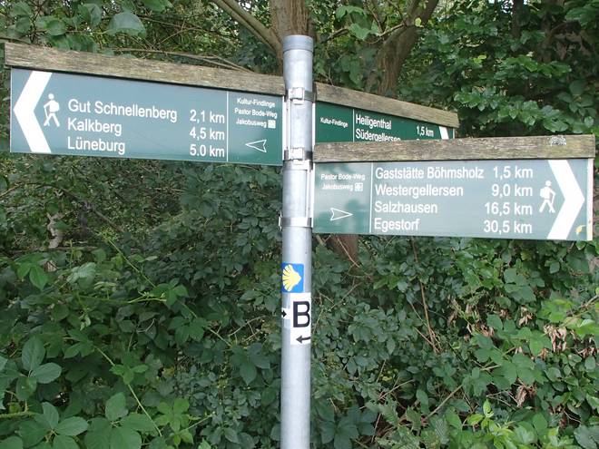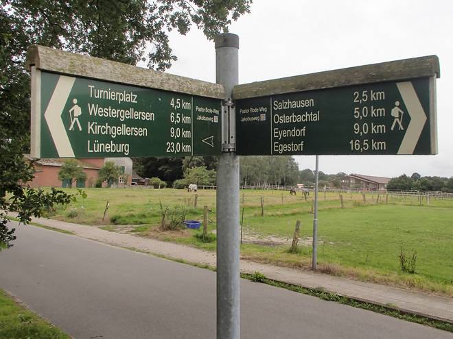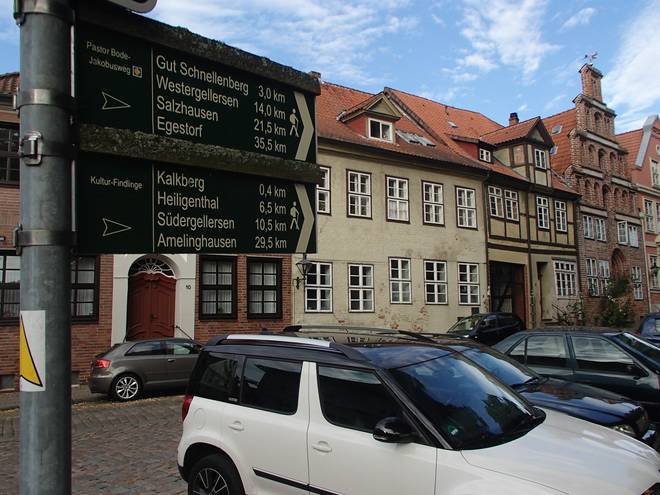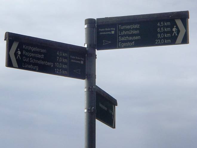 Lüneburg Johann-Sebastian-Bach-Platz 8.05 Uhr / Km 0,2 Diesen Schildern sollte ich nun also die 44 Kilometer bis nach Wilsede folgen. Und danach zum Wilseder Berg und weiter nach Döhle laufen. Nettes Tagesprogramm. |