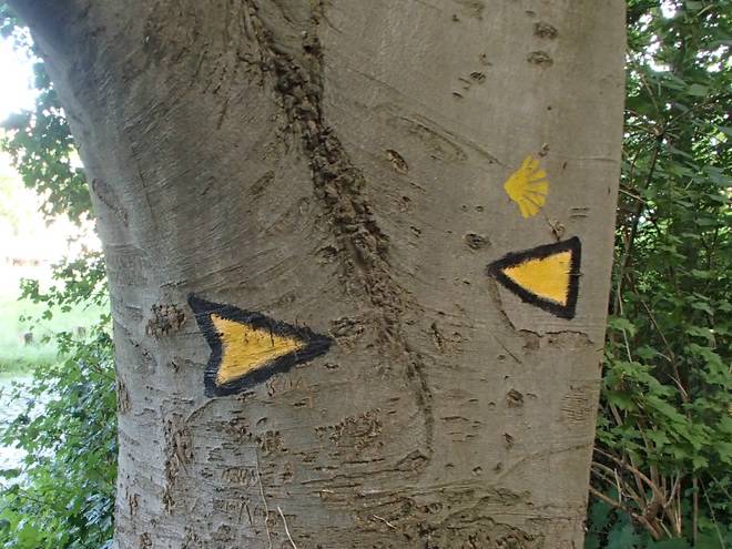 8.51 Uhr / Km 5,5 Ohne Handy und GPS wäre ich wohl verloren gewesen. Die nicht sehr konkreten Pfeile hier hätten mich auf den falschen Weg geführt. Aber auf dem Handy war schon nach ein paar Metern zu erkennen, daß ich vom rechten Weg abzukommen drohte. |