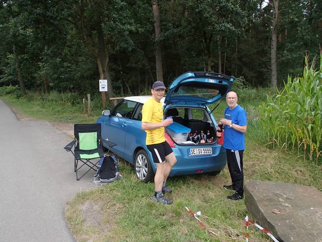 Westergellerser Heide 10.14 Uhr / Km 17,9 Der erste Verpflegungspunkt war erreicht. Hier schenkte Manfred Getränke aus und verteilte Süßigkeiten. 2:14:35 Stunden war ich schon unterwegs. Etwas mehr als ein Drittel der Strecke hatte ich geschafft. Vorausgesetzt ich würde mich nicht verlaufen. |