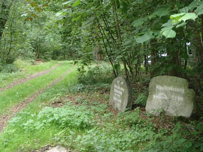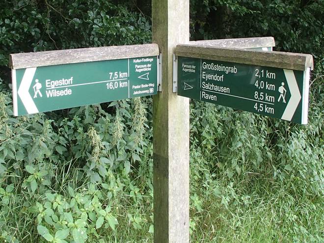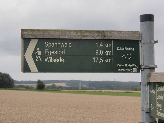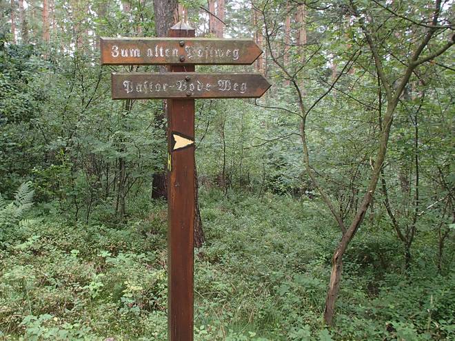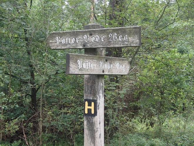 12.45 Uhr / Km 38,7 Schön viele Hinweisschilder. Hügelgräberweg, Turm, Döhler Kirchweg, Waldsiedlung. Und der Pastor-Bode-Weg? |