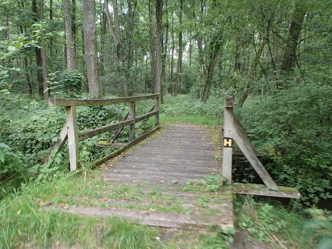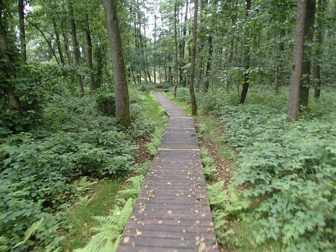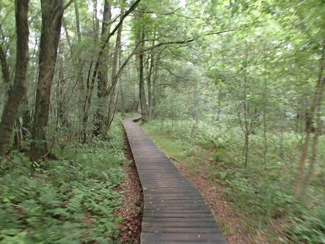 12.54 Uhr / Km 40,3 Ein schöner Bohlenweg. Der war eigentlich breit genug. Ich wäre trotzdem mehrfach fast herunter gefallen. Balancieren ist nicht mehr Sache. Auch nicht auf einem einen Meter breiten und ein paar Zentimeter hohen Balken. |