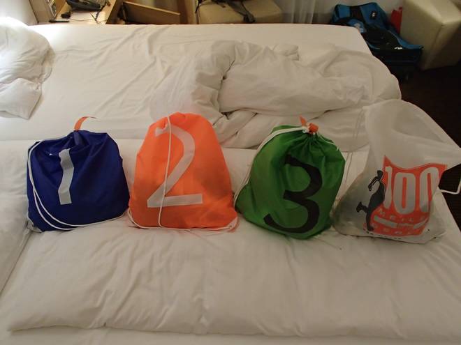 Hotel H4 am Alexanderplatz 4.28 Uhr So ein 100-Meilen-Lauf ist eine logistisches Herkulesaufgabe. Auch für den Läufer. Drei Beutel für die Wechselpunkte und einen fürs Ziel. Morgens starten und dann den ganzen Tag und die ganze (?) Nacht laufen. Im Zweifel lieber mehr als zu wenig einpacken. |