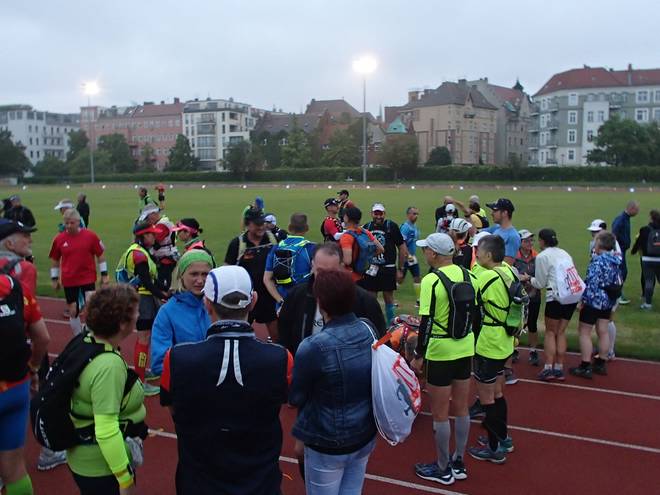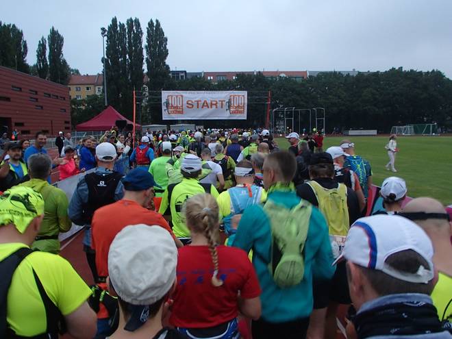 Friedrich-Ludwig-Jahn-Sportpark 6.00 Uhr Ich wollte es ruhig angehen lassen. 30 Stunden war das Zeitlimit. Aber bis 24 Stunden gab es noch eine gesonderte Gürtelschnalle. Auf die hatte ich es sekundär abgesehen. Wichtiger aber: durchkommen, überleben, Medaille abgreifen. |