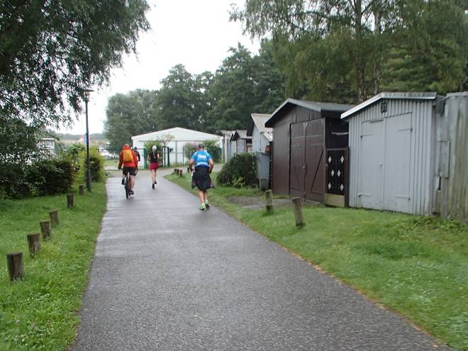 Uferpromenade 10.08 Uhr / Km 34 Eigentlich hätte ich ab hier die Kopfhörer aufsetzen dürfen. Aber ich hatte jetzt etwas viel besseres: meine Fahrrad-Begleitung Romy. Sie hatte im Regen auf mich am sechsten Verpflegungsstand gewartet und wollte nun mich über die nächsten Stunden begleiten. |