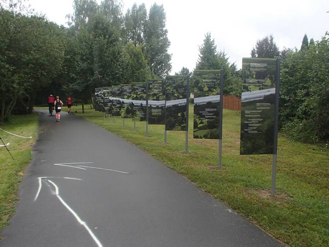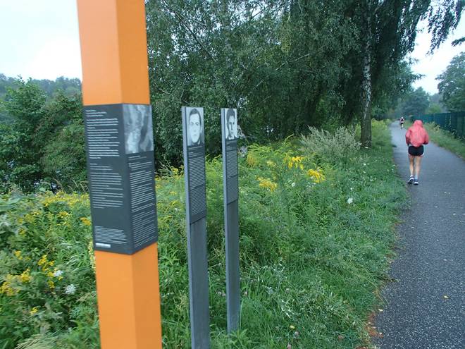 Uferpromenade 10.19 Uhr / Km 35,5 Die Gedenkstehlen fand man immer wieder entlang des Kurses. Sie markieren die Stellen, an denen während der Deutschen Teilung "DDR"-Flüchtlinge beim Fluchtversuch getötet wurden. |