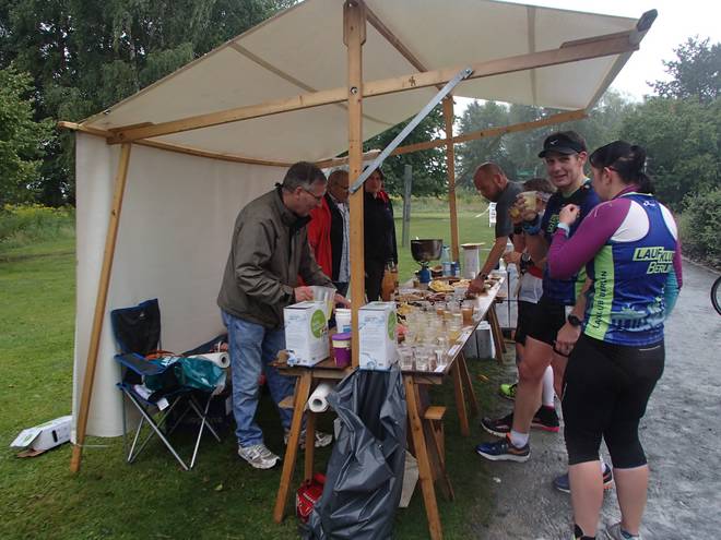 Karolinenhöhe 13.08 Uhr / Km 58,5 Das war nun schon der zehnte Verpflegungsstand. Nun ja... noch 17. Aber das erste Drittel war schon einmal geschafft und auch trotz der Aufpumperei hatte ich das erste Drittel klar unter sieben Stunden geschafft. Der Stand wurde vom Team Mauersberger & Kollegen betreut. |