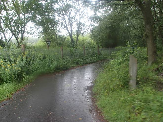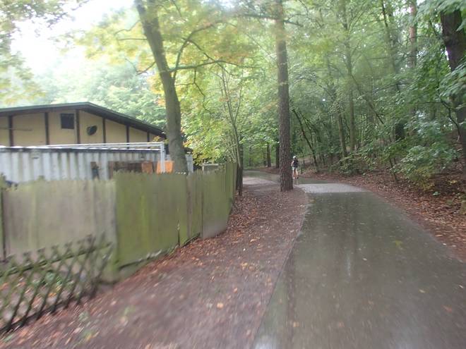 Spandauer Forst 11.09 Uhr / Km 43 Die Dauerdusche wollte nicht enden. Immer noch sehr dichter Nieselregen. Der schlug sich nun auch auf die Kameralinse nieder. |