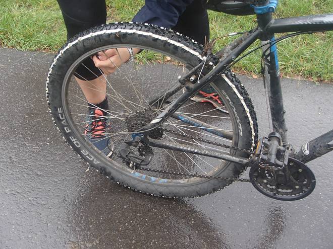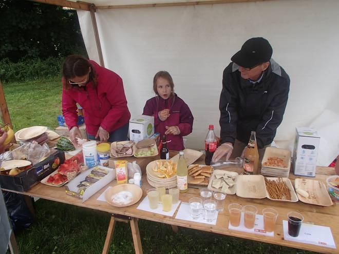 12.12 Uhr / Km 52 Romy nutzte meine Pause am Verpflegungsstand, um den Hinterreifen am Fahrrad aufzupumpen. Der war ein wenig platt. |