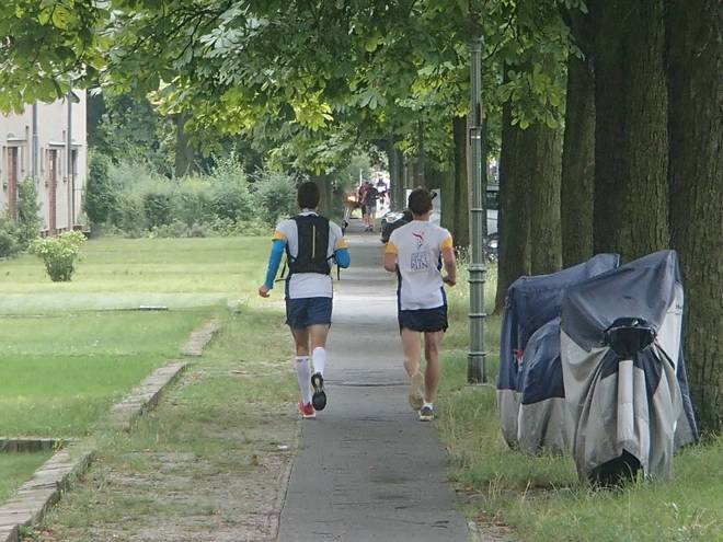 Potsdamer Chaussee 13.42 Uhr / Km 61 Die Möglichkeit, den Lauf alleine bestreiten zu müssen, hatte ich von Anfang an mit einplant und insofern auch alles dabei. Das war auch mit Romy so besprochen. Sie war zwar eine Riesenhilfe, aber nicht zwangsverpflichtet. Außerdem konnte immer etwas passieren, weswegen sie nicht oder nicht den ganzen Weg dabei sein konnte. |