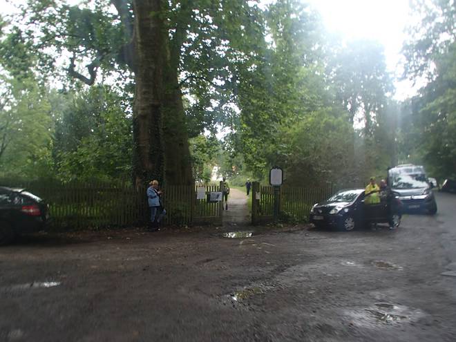 Krampnitzer Straße Schloß Sacrow 14.53 Uhr / Km 71 Fast wäre ich am Schloß vorbei gerannt. Das Tor war sehr unscheinbar. Nun durch die vielen Autos und Leute (die letzte halbe Stunde hatte ich keine Menschenseele mehr getroffen gehabt) war ich auf die kleine Pforte aufmerksam geworden. |