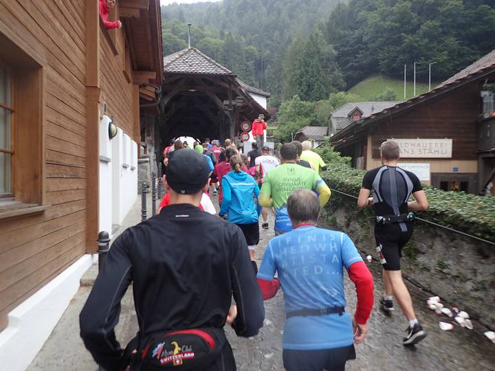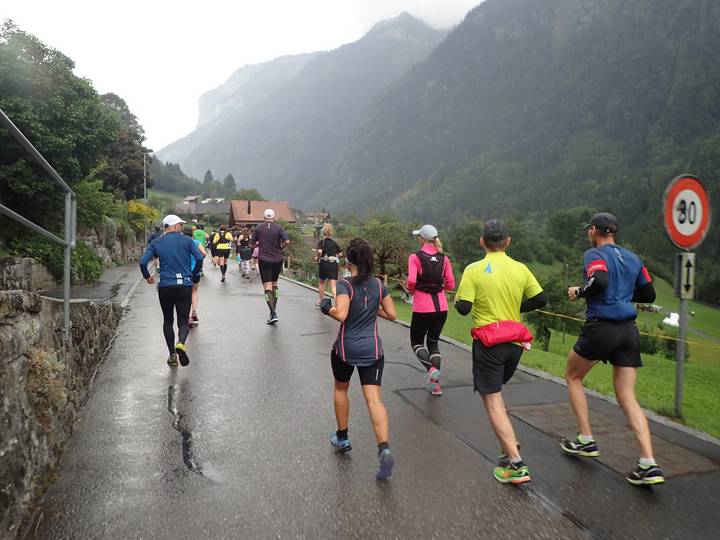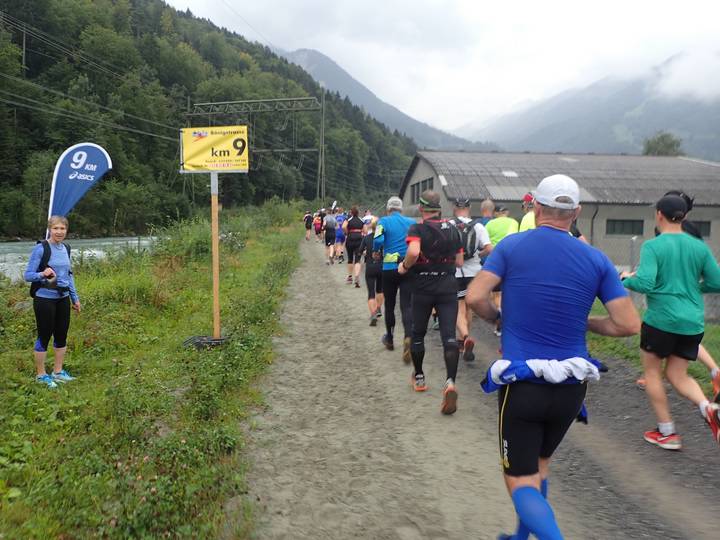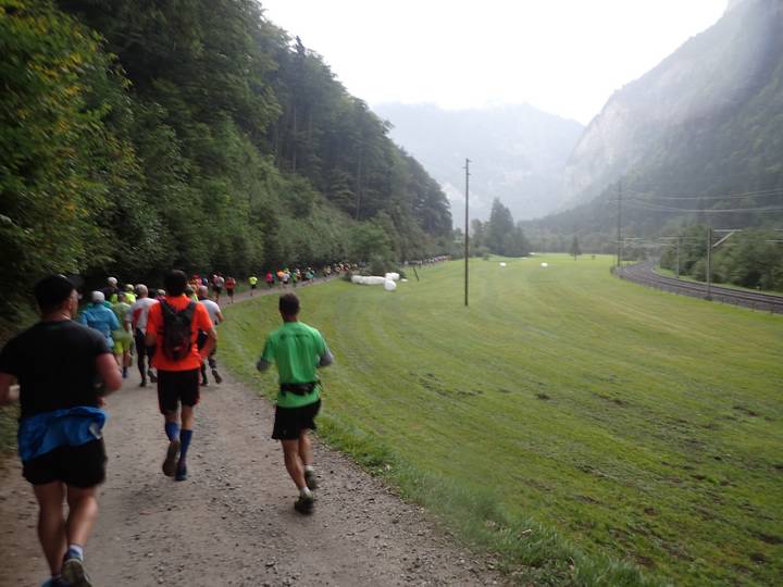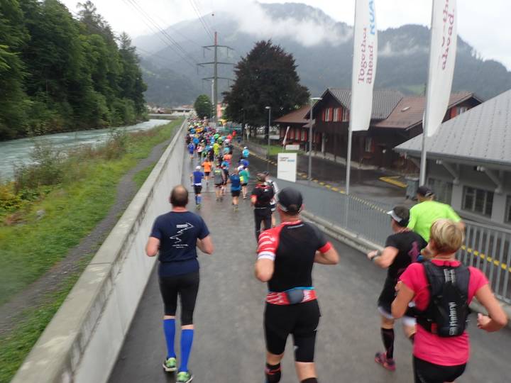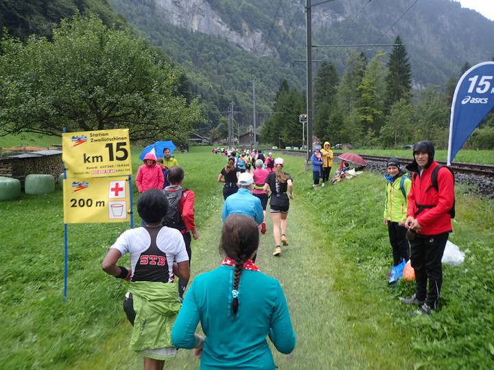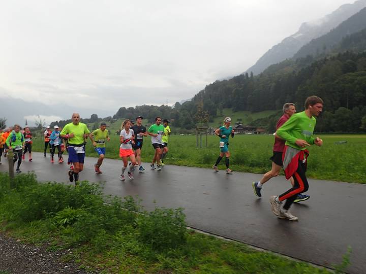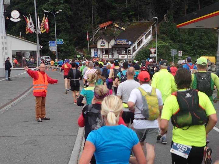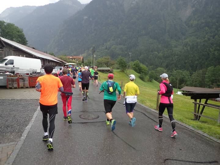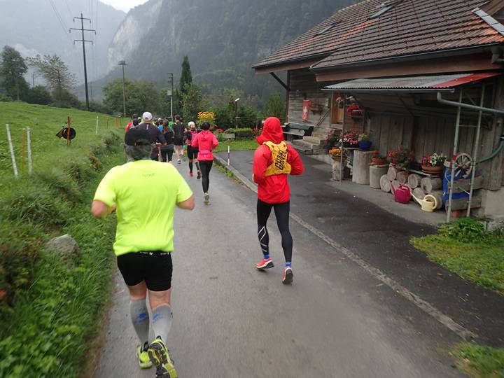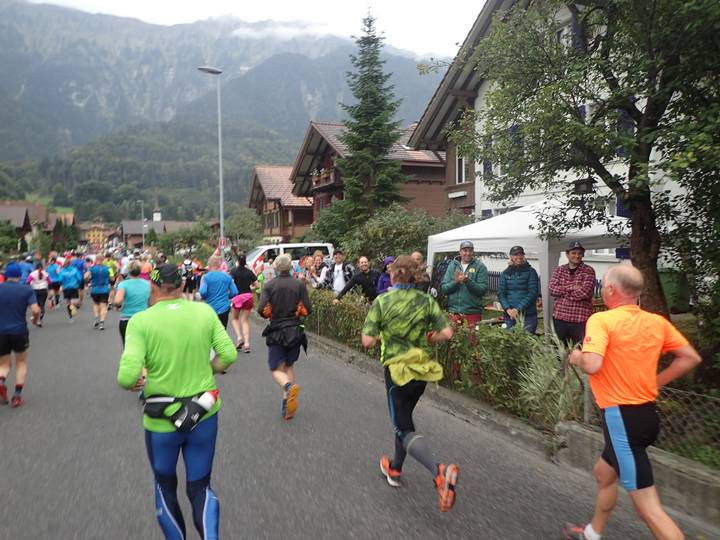 Hinter der Egg 10.23 Uhr / Km 15,3 Ich war hinter dem gedachten Zeitplan ein wenig zurück, aber das machte mich nicht nervös. Interessant würde es erst ab Kilometer 25 werden, wenn es an den Anstieg hinauf zum Jungfrau ging. Wenn ich bis dahin mit der Masse locker würde mitlaufen können, wäre alles in Ordnung. |