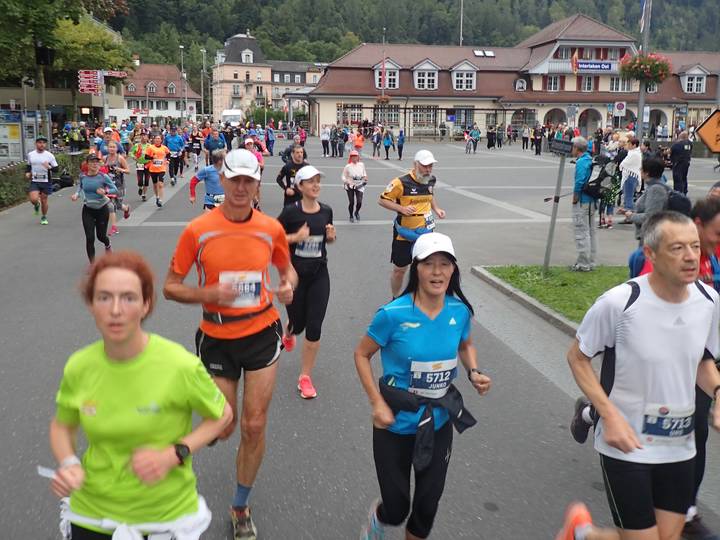 Höheweg Interlaken 8.52 Uhr / Km 0,4 Nach dem Start liefen wir eine Runde durch Interlaken. Anders als in den Vorjahren ging es nach dem Start nach Westen und dann im großen Bogen raus aus der Stadt. Der diesjährige Blockstart machte die Änderung notwendig. Bisher ging es nach Osten und nach einem Bogen noch einmal an der Höhematte beim Start vorbei. |