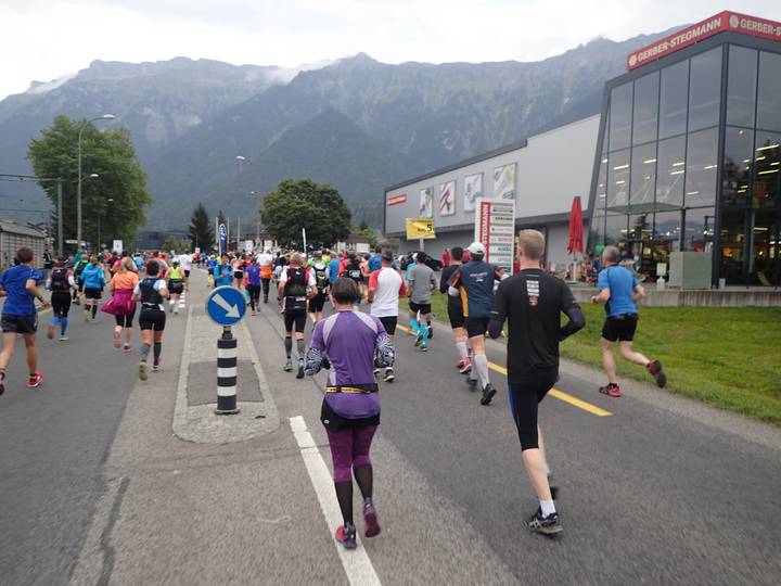 Untere Bönigstrasse Interlaken 9.18 Uhr / Km 5,0 ... und noch durch ein wenig Industrie. Kurz zuvor gab es sogar einen Aldi. Fünf Kilometer in nur 28:36 Minuten. Eigentlich wollte ich ruhiger starten und auf 6:00 Min/Km anlaufen. Aber die zugehörigen Zeitläufer waren schon weit weg. Oder meinte das Schild 6:00 Stunden? Abe selbst wenn... laut dem ASICS-Rechner war ich selbst für 5:30 Stunden eher zu schnell. Egal... einfach weniger denken und mehr laufen. Wird schon. |