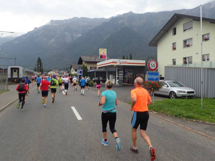 Klosterstrasse Interlaken 9.07 Uhr / Km 3,0 Die Starterbeutel-LKWs waren abgefahren, nun konnten wir hier langlaufen. |