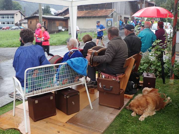 Halten Gsteigwiler 9.57 Uhr / Km 11,3 Die Musikgruppe ließ sich durch den Regen und der Hund durch gar nichts nicht aus der Ruhe bringen. |