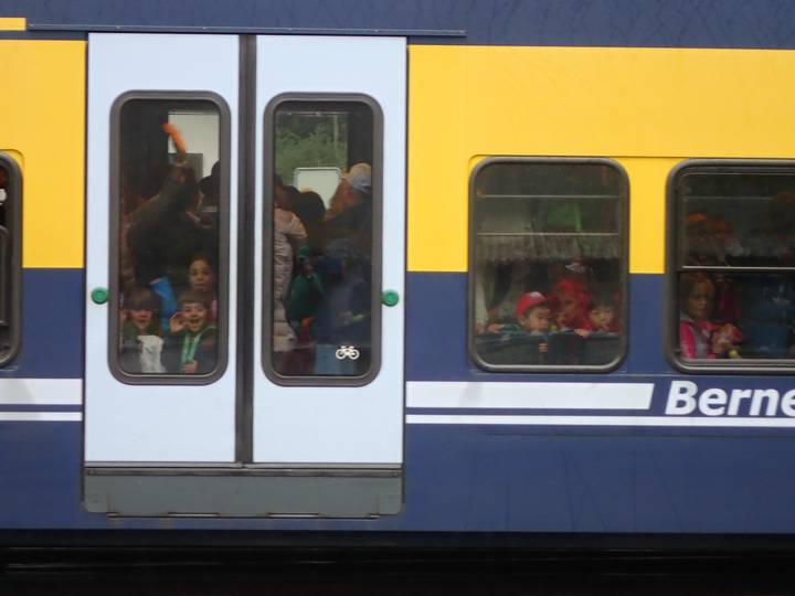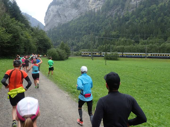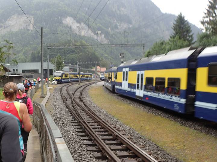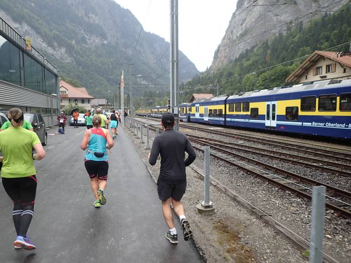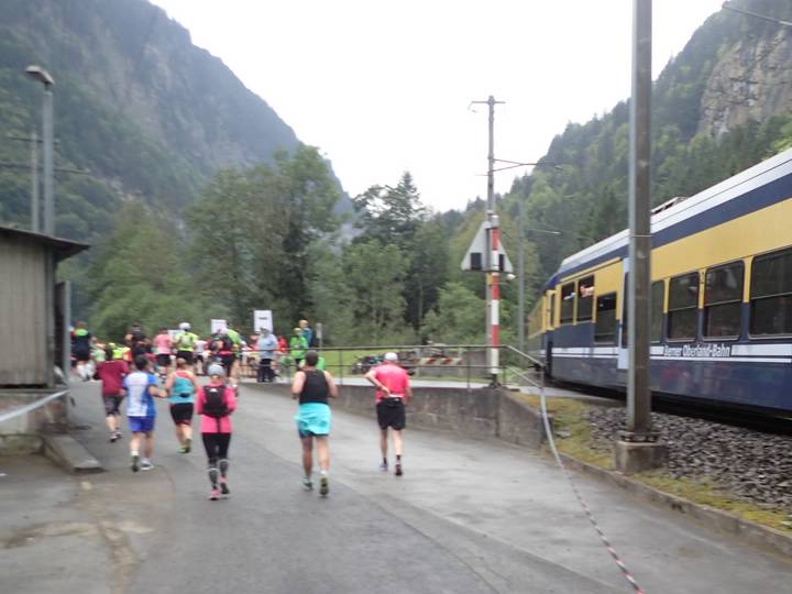 Faltsche 10.17 Uhr / Km 14,4 Die Bergbahn von Interlaken nach Lauterbrunn (dort konnte man in einen Zug Richtung Kleine Scheidegg, also zum Ziel, umsteigen) war beliebtes Fotomotiv. Und die Hälfte der Läufer war eifrig am Winken. Im Zug war sicherlich einiges an Bekannten und Familie. |