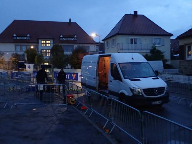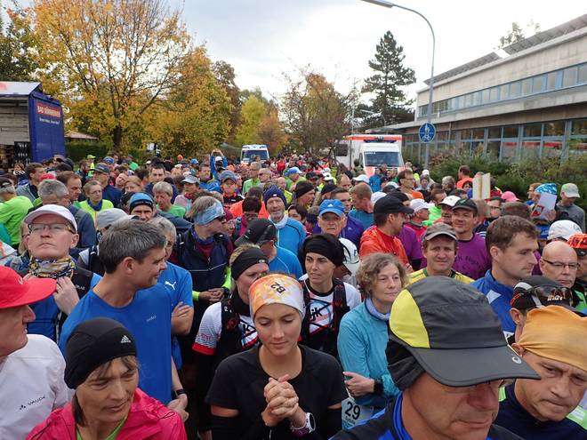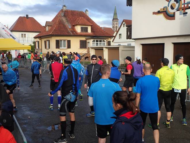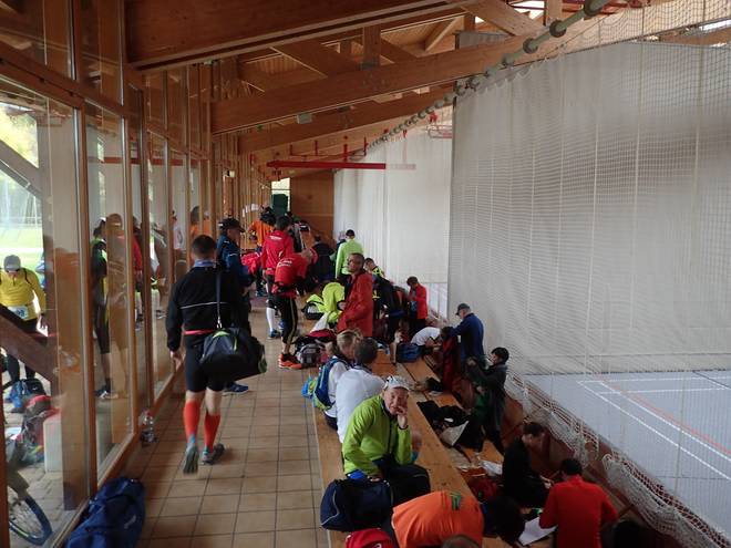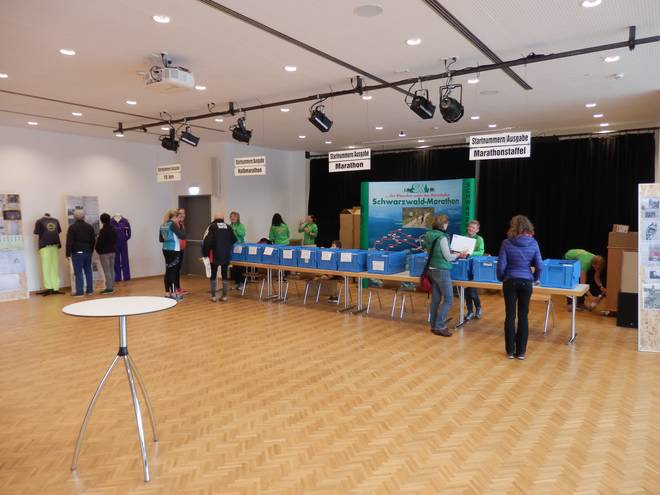 Stadthalle Bräunlingen 7.16 Uhr Hier war noch weniger los als am Vortag. Dabei gab es da drinnen lecker Frühstück. Essen ist am Marathon-Tag nicht so mein Ding, also für mich nur die Wärme der Halle, aber kein Frühstück. |