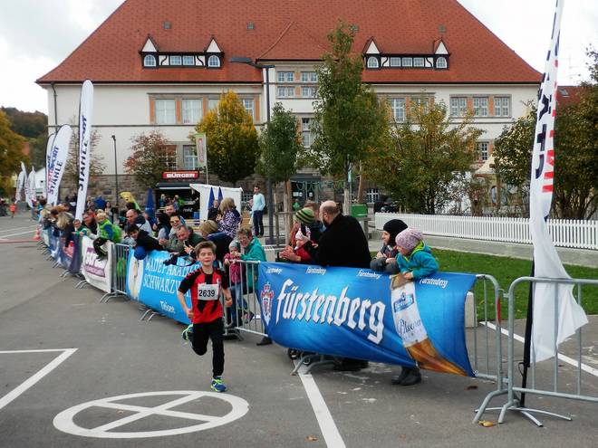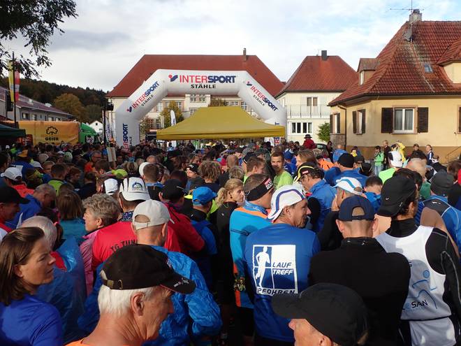 Schulstraße 9.27 Uhr Immerhin hatte der Marathon mehr Starter als der Zehner am Vortag (354 Läufer). Der Halbmarathon lag aber mit 1065 Läufern vorne. Hier im Feld starteten noch 33 Staffeln mit. In den 70er Jahren war der Schwarzwald-Marathon mal teilnehmerstärkster Lauf. Und zwar weltweit!! Dafür reichten damals 1500 Läufer. |