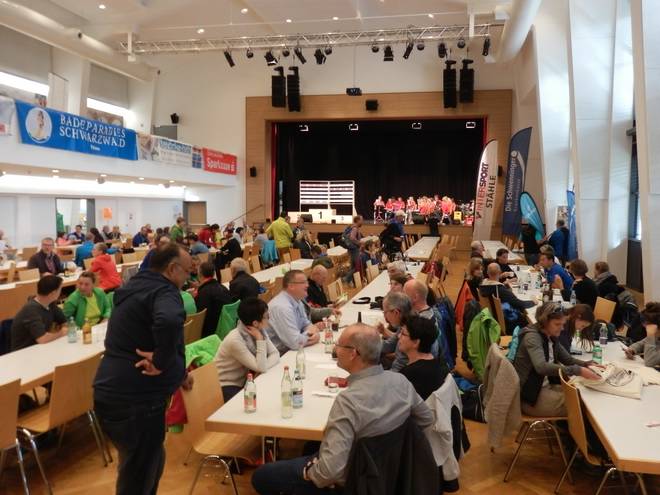 Stadthalle Bräunlingen 16.19 Uhr Nach dem Schüler-Lauf hatte ich mich umgezogen und war beim 10-Kilometer-Lauf um 15.00 Uhr gestartet. Danach hatte ich mich wieder umgezogen und kam zurück in die Halle zur Maultaschen-Party. |