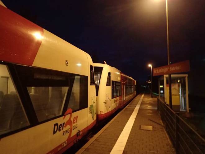 Bräunlingen Bahnhof 6.57 Uhr Noch im Dunkeln kam ich mit dem Zug aus Hüfingen. Man hätte die Strecke auch zu Fuß gehen können, aber in der Dunkelheit durch den Wald? |