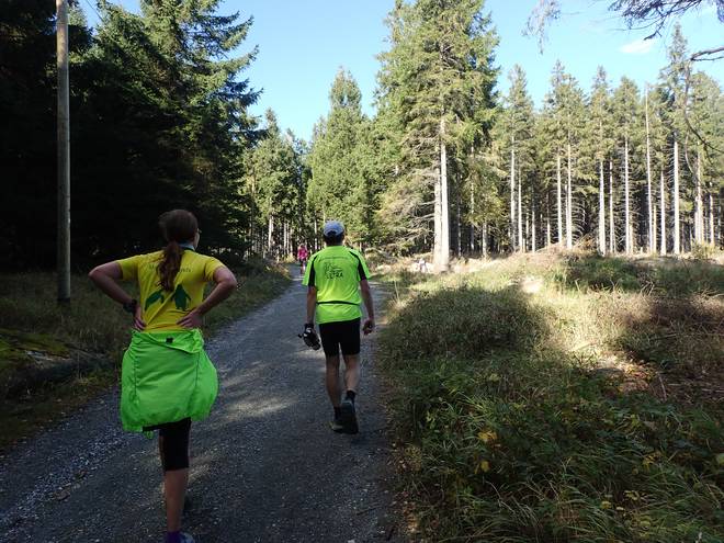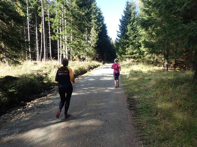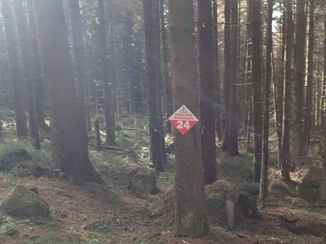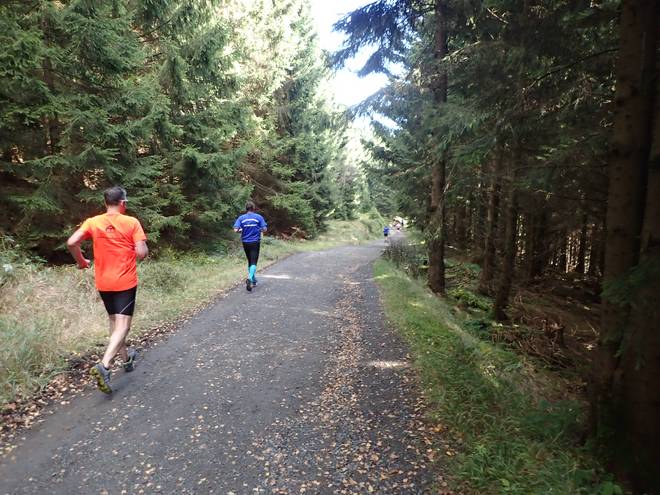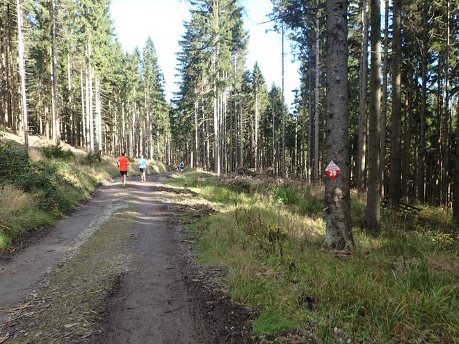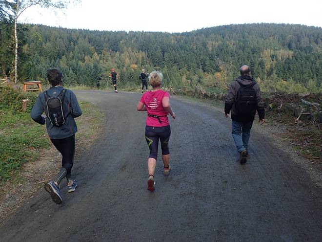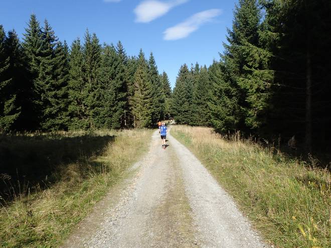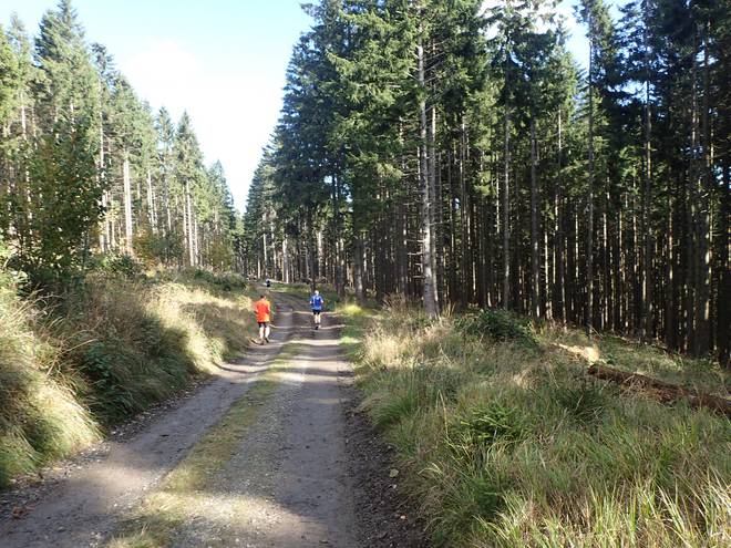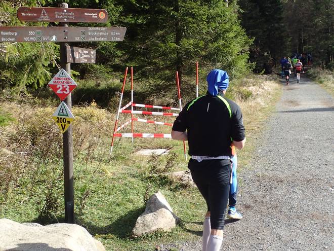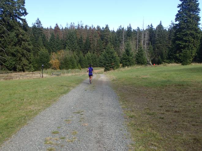 Brockenstraße Glashüttenweg 11.57 Uhr / Km 23,0 Wir liefen von der Straße auf einen Wanderweg, der direkt auf einen Wald zuführte. Das versprach eine schönere Strecke als die auf der Straße. |