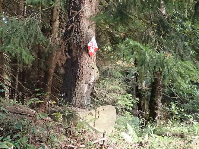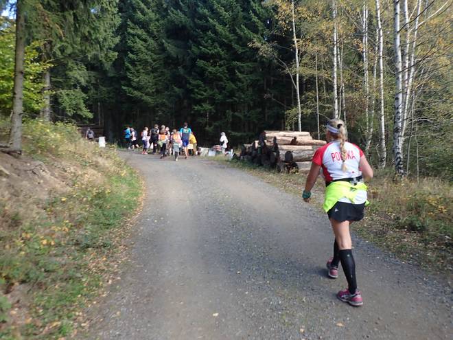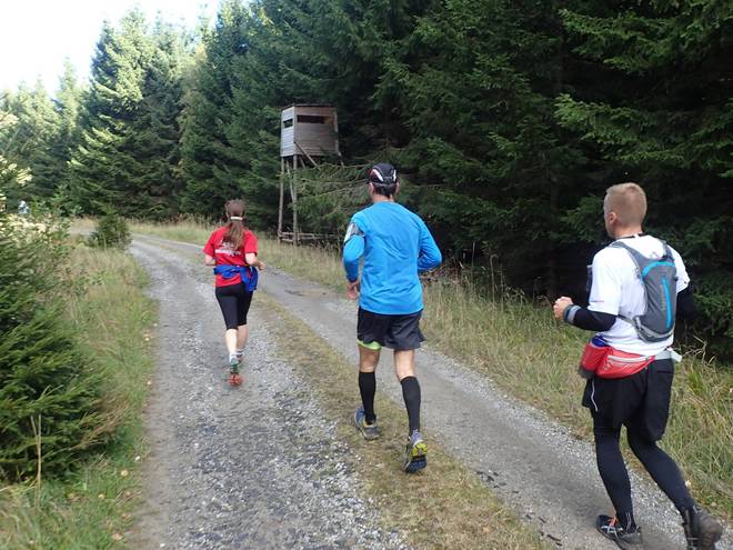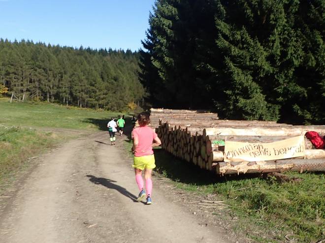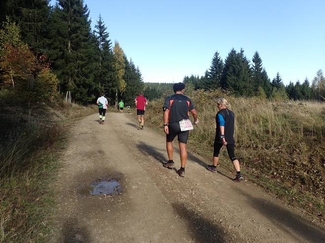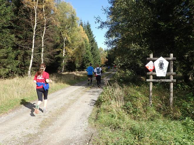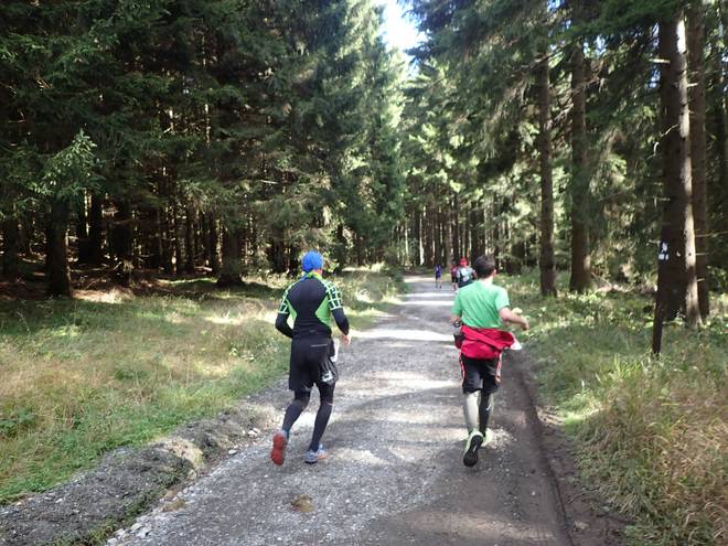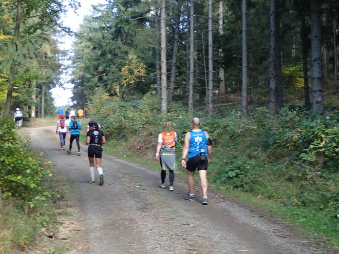 Oberförster-Koch-Weg Mönchsbuche 13.22 Uhr / Km 36,6 Der achte Verpflegungsstand lag am Ende einer Steigung. Auf dem Weg konnte ich noch einmal Läufer überholen, die mich dann bald alle wieder überholen würden, sobald es wieder bergab ginge. Immer dieselbe Geschichte. |