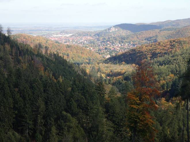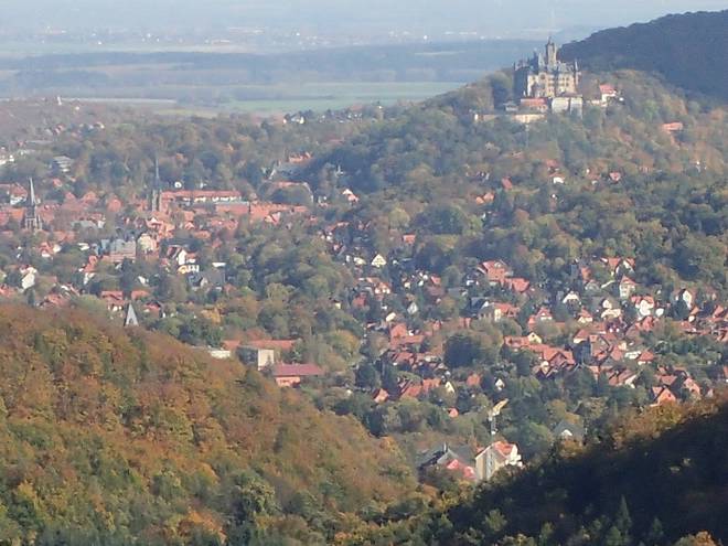Pieperhang 13.40 Uhr / Km 39,1 In der Ferne konnte man schon Wernigerode erkennen. Lag aber ganz schön weit unten. Das sah nicht nach lustigen letzten Kilometern aus. |
