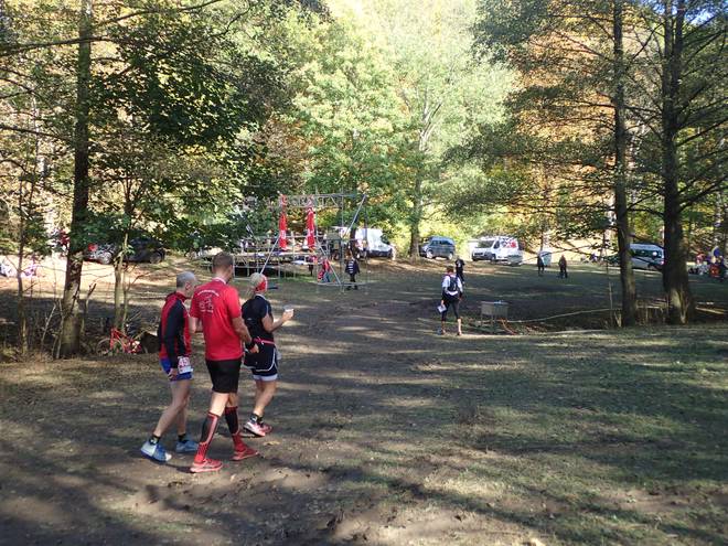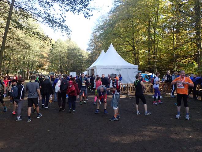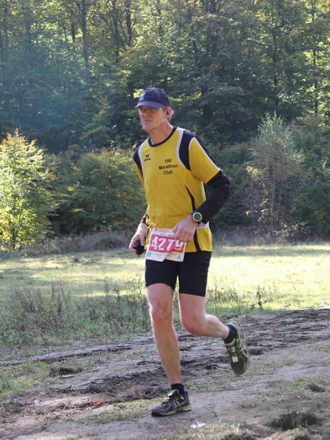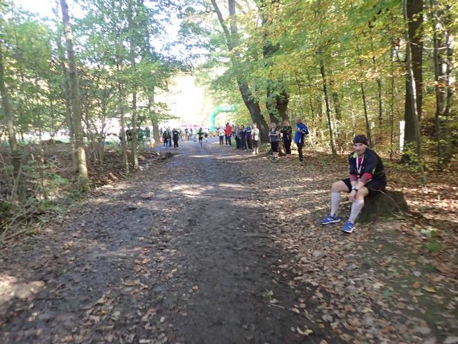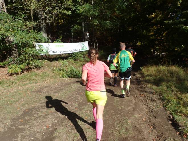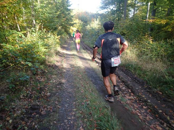 Kuhborn 13.50 Uhr / Km 41,3 Nun rannte auch ich wie ein Bekloppter über den schmalen und teilweise rutschigen Weg. Es machte einfach Spaß. |