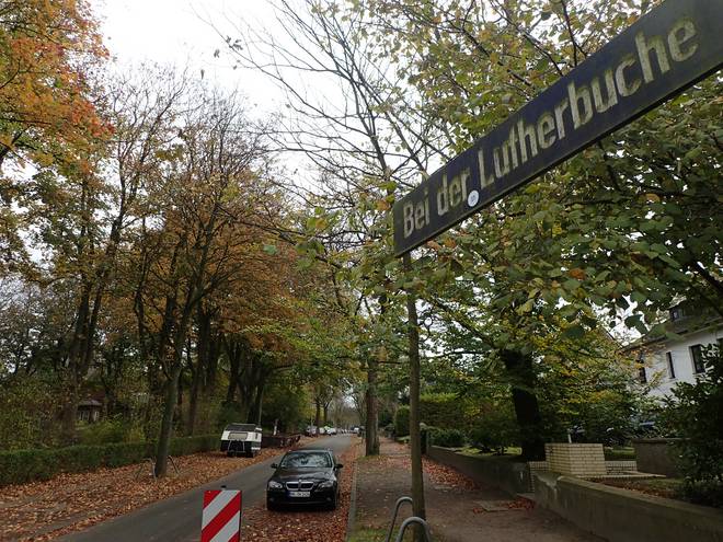 Bei der Lutherbuche 10.02 Uhr / Km 0,02 Und los ging es zum Luther-Sightseeing durch Hamburg. |