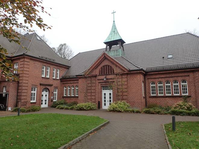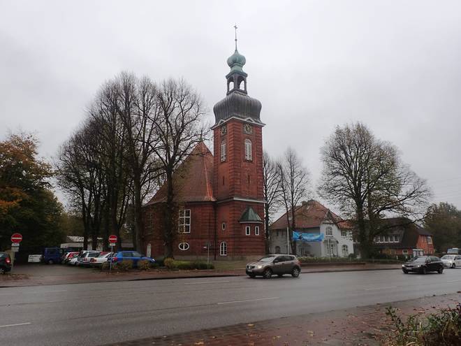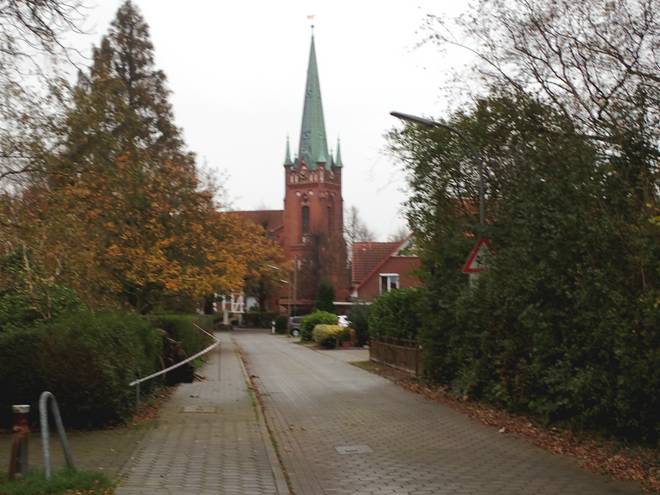 Osterkirche Bramfelder Chaussee 11.10 Uhr / Km 11,8 Wieder hatte ich hatte Glück mit dem Verkehr und querte auch diese vier Spuren ohne anhalten zu müssen. |