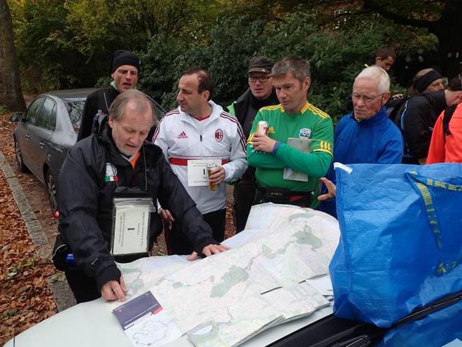 Bei der Lutherbuche 9.43 Uhr Das Briefing vor dem Start. Christian erklärte die Strecke anhand einer Karte, von der jeder Teilnehmer ein Exemplar mit bekam. Jede Karte mit von Hand eingezeichneter Strecke. Daneben gab es aber auch einen GPS-Track fürs Handy, den Rico und ich gebastelt hatten. |