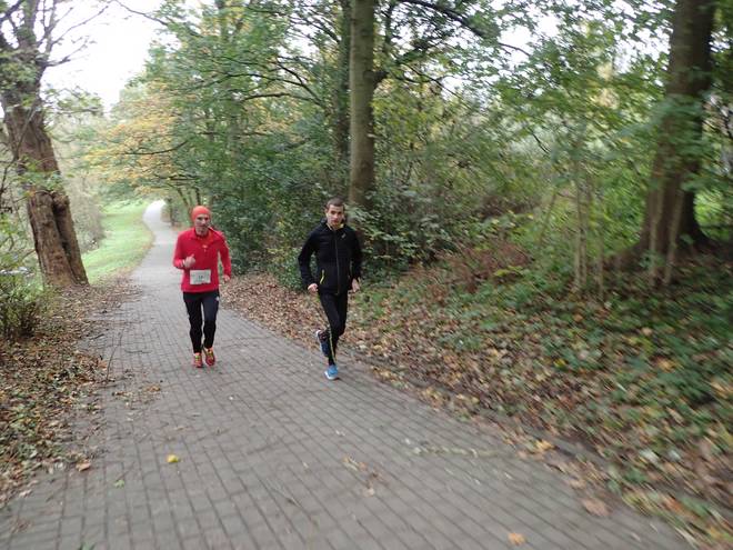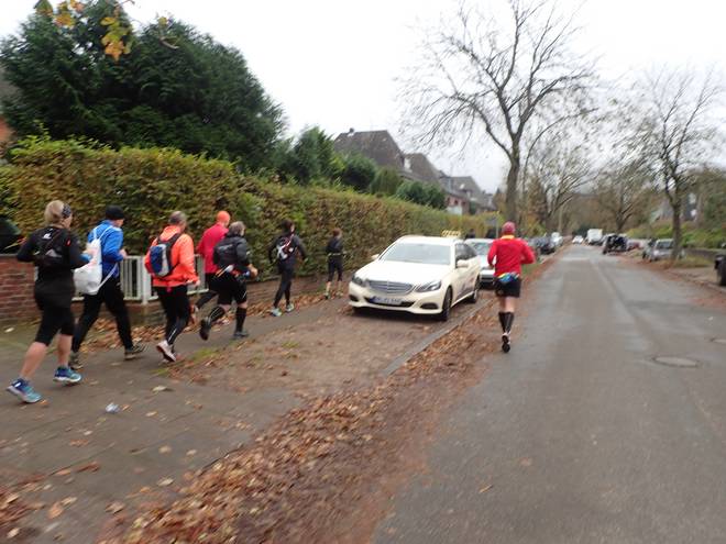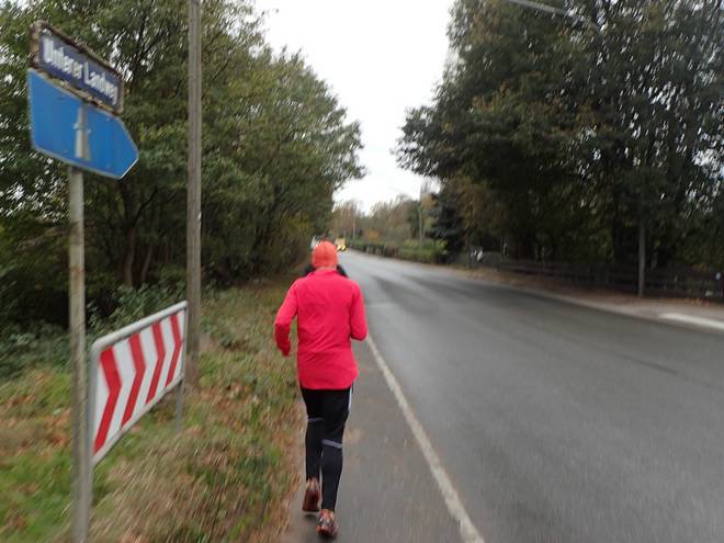 Eichenlohweg 10.53 Uhr / Km 9,0 Während sich die Gruppe über die Getränke hermachte, lief ich weiter. Zusätzlich zu der Erkältung hatte ich nun auch Magenschmerzen und wollte lieber nicht trinken. Aber auch nicht herumstehen und kalt werden. |