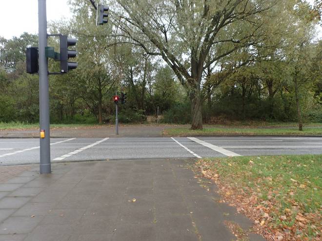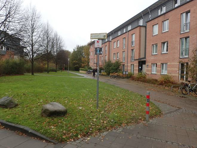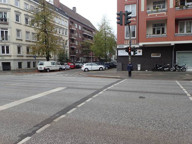 Tarpenbekstraße Geschwister-Scholl-Straße 10.13 Uhr / Km 2,0 Die Straßen mußte man auf eigenes Risiko queren. Eine Weile warteten wir hier bei Rot. Dann fragte jemand, ob in der Ausschreibung was stand bezüglich der Einhaltung der Straßenverkehrsordnung. Wir waren uns alle sicher, daß Nein. |