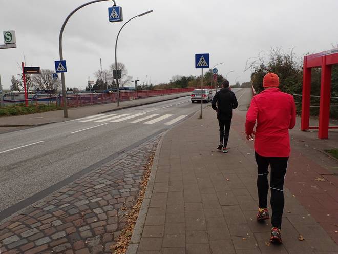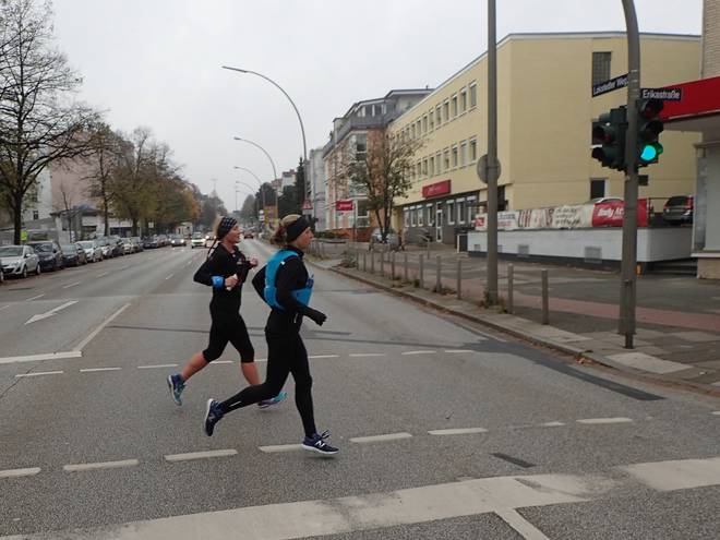 Lokstedter Weg Erikastraße 10.15 Uhr / Km 2,3 So liefen wir eben rüber. Kam eh kein Auto. Und hier bei der nächsten Ampel machten wir es gleich wieder. Auch elfeinhalb Wochen nach dem Mauerlauf Berlin war es ein saugeiles Gefühl, bei Rot über die Ampel zu laufen. |