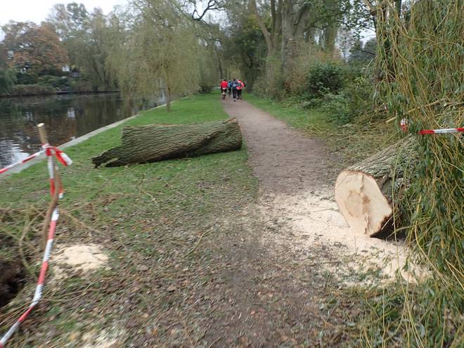 Alsterwanderweg 10.20 Uhr / Km 3,2 Am Wochenende zuvor hatte der Sturm Herwarth schwere Schäden angerichtet. Davon war auch die Strecke nicht verschont geblieben. Echte Probleme gab es aber nicht. |