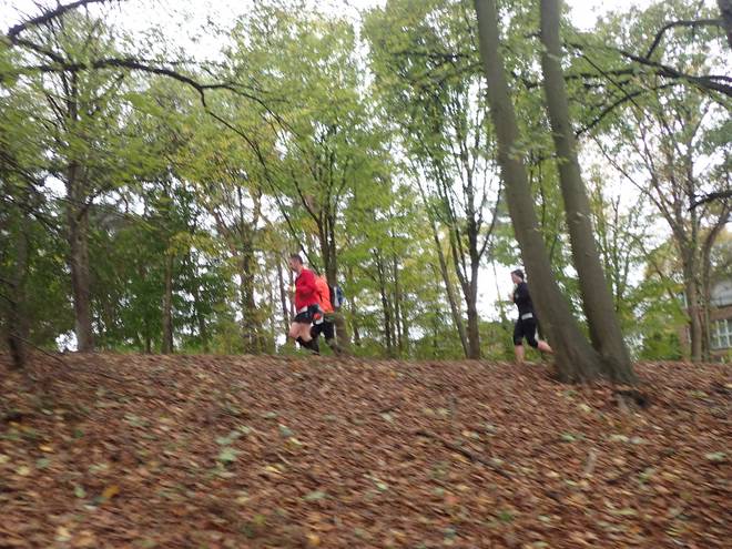 Schleemer Bach 12.32 Uhr / Km 25,6 Tobias (rot) und Rico (schwarz) direkt hinter mir. Meist liefen wir aber zusammen. Gänzlich ungewöhnlich für mich, der sonst nur alleine läuft. Aber es war ja auch ein besonderer Tag. |