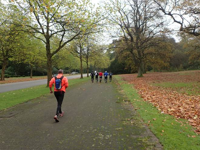 Fuhlsbüttler Straße Friedhof Ohlsdorf 10.45 Uhr / Km 7,5 Da hatte ich wohl Glück mit der Ampel gehabt (bzw. mit nicht vorhandenen Verkehr als ich bei Rot rüber lief...). Ich lief zwar 110 Meter mehr, kam aber zeitgleich mit der Gruppe an. |