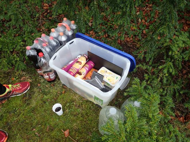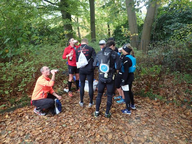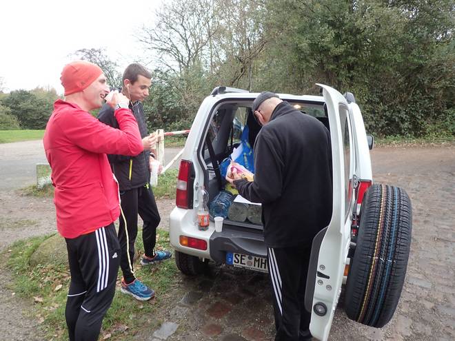 Bruhnrögenredder Öjendorfer Park 12.05 Uhr / Km 21,5 Der zweite Verpflegungsstand war bemannt. Hier verteilte Manfred Leckereien und Getränke. Im Rucksack hatte ich eine Trinkflasche dabei, füllte sie aber nicht auf. Immerhin trank ich nun etwas. Foto: Tobias |