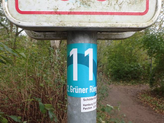 Osterbek 11.23 Uhr / Km 14,2 Seit dem Alsterwanderweg folgte die Strecke dem des 2. Grünen Ringes. Einem gut ausgeschilderten 100 Km langen Wanderweg durch Hamburg. Das erleichterte das Orientieren ungemein. Ich mußte fast nie auf das Handy schauen. |